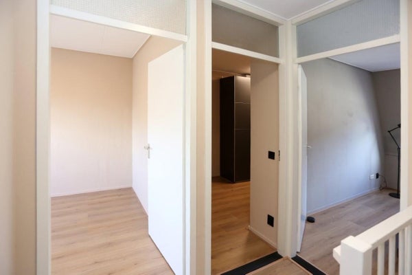 Escaliers vers le 2ème étage où vous trouverez 2 chambres. La 3ème pièce peut être utilisée comme dressing, bureau ou buanderie. La salle de bains est également toute neuve avec un toilette, un chauffe-serviettes, un lavabo et une douche.