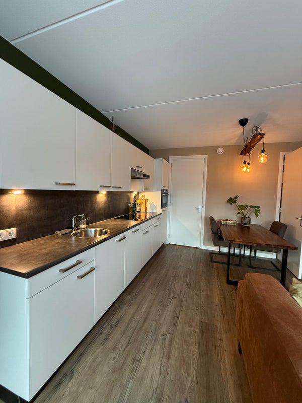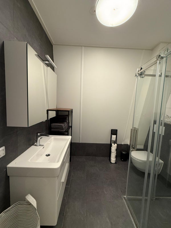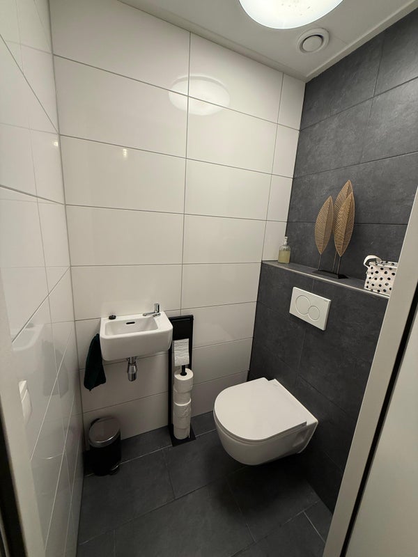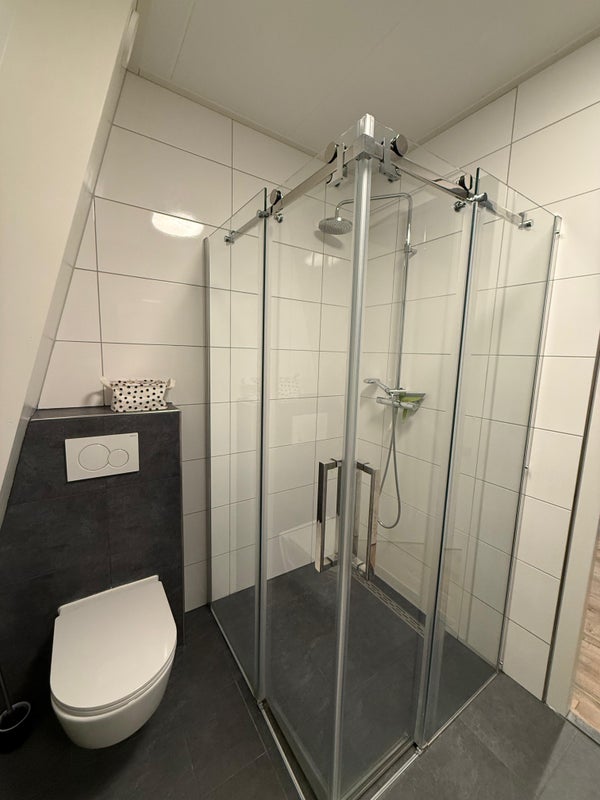 Le logement est entièrement autonome et équipé d'une nouvelle cuisine avec divers appareils encastrés, notamment une plaque de cuisson à induction, une hotte aspirante, un réfrigérateur et un lave-vaisselle. La salle de bains est équipée d'une douche et d'un lavabo, et il y a des toilettes séparées.