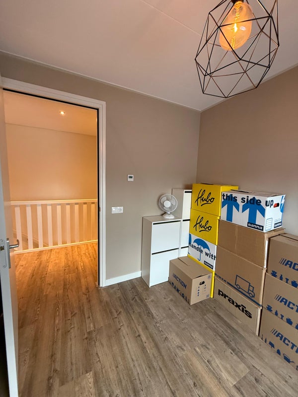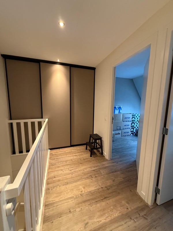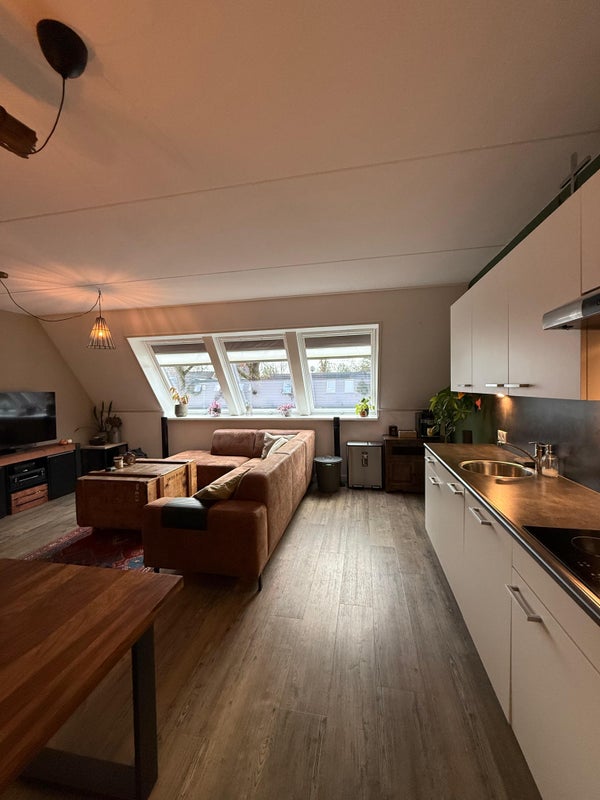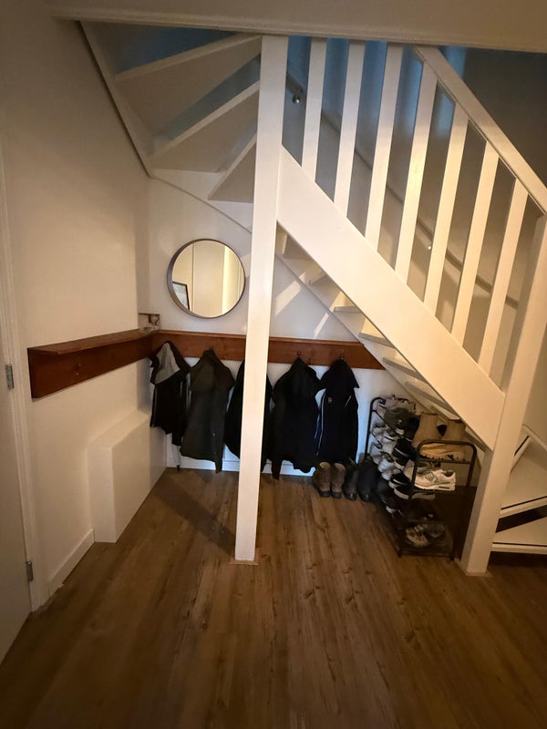 Cet appartement est situé au premier et au deuxième étage du bâtiment. Par un hall central, on peut accéder au salon avec cuisine ouverte, situé à l'avant du bâtiment. Les grandes fenêtres offrent une vue dégagée et laissent entrer beaucoup de lumière. Au deuxième étage, deux chambres sont accessibles par un escalier fixe. La salle de bains se trouve également au deuxième étage. L'appartement dispose d'un débarras au rez-de-chaussée.