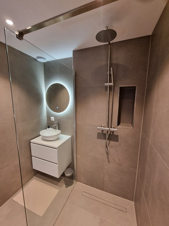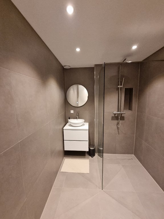 Palier, couloir avec escalier menant au deuxième étage, chambre/bureau, salle de bain luxueuse avec meuble lavabo, miroir anti-condensation avec éclairage et douche à l'italienne spacieuse. Toilettes séparées (suspendues) avec lavabo. Buanderie avec lave-linge/sèche-linge combiné et espace de rangement supplémentaire (notamment pour aspirateur). À l'arrière de l'appartement se trouve le grand séjour avec cuisine ouverte, équipé d'une plaque de cuisson à induction, d'une hotte aspirante, d'un lave-vaisselle, d'un combiné réfrigérateur/congélateur et d'un four électrique.