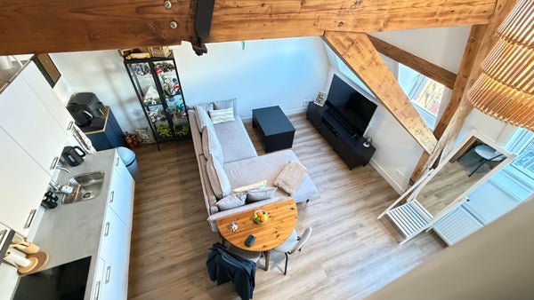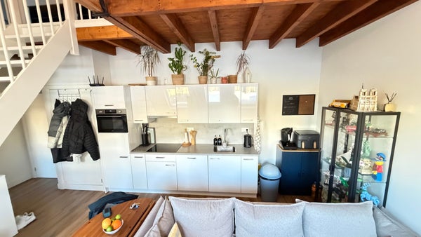 Description Cet appartement rénové de haute qualité est situé au deuxième et au troisième étage à l'avant d'un monument municipal caractéristique. Les hauts plafonds et les grandes fenêtres offrent une grande luminosité et une sensation d'espace.