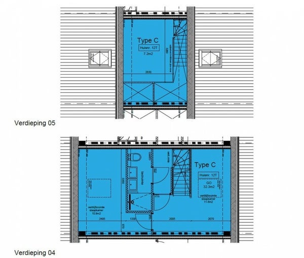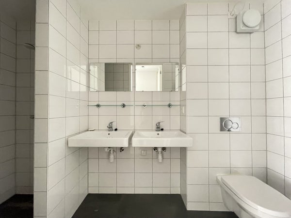 Palier avec accès à la salle de bain, qui est équipée d'un 2ème toilette, d'une douche à l'italienne, d'un double lavabo et d'un radiateur design. Accès à la première chambre d'environ 11 m² (celle-ci ne peut pas être fermée) à l'avant. Chambre principale à l'arrière d'environ 10 m².