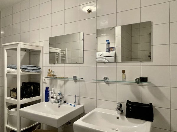 Accès à l'appartement. Couloir avec des portes menant à toutes les pièces. Toilettes séparées. Salle de bains équipée d'un double lavabo et d'une douche à l'italienne. Radiateur de luxe et raccordement pour la machine à laver. La salle de bains est entièrement carrelée.