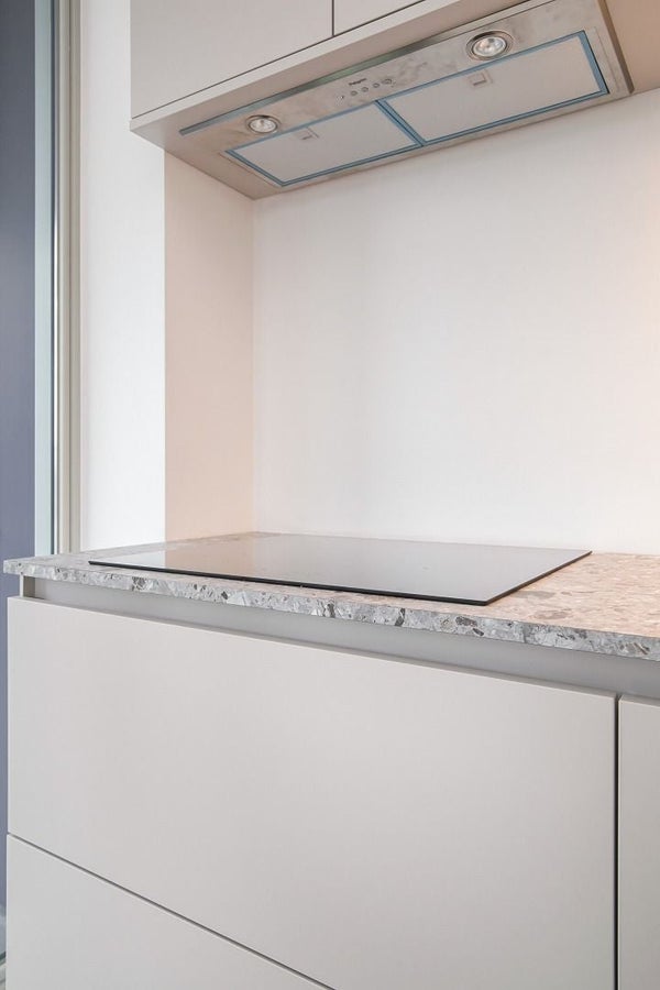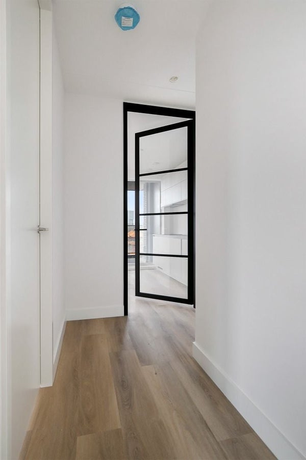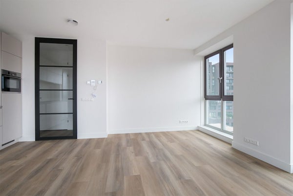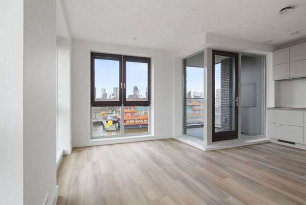 Cet appartement flambant neuf au cinquième étage respire le luxe avec deux chambres spacieuses et une salle de bain équipée d'un radiateur à serviettes, d'un lavabo élégant et d'une douche à l'italienne fermée par du verre. La lumière inonde généreusement le salon grâce aux nombreuses baies vitrées, qui donnent un accès direct à une terrasse privée où la dynamique de l'eau et le calme se rejoignent pour une expérience de vie sereine. La cuisine ouverte est équipée de divers appareils intégrés, y compris un four avec fonction micro-ondes, un lave-vaisselle, une plaque de cuisson à induction et un grand réfrigérateur. Pendant que vous êtes dans la cuisine, vous pouvez profiter de la vue sur votre terrasse et l'environnement animé du quai.
