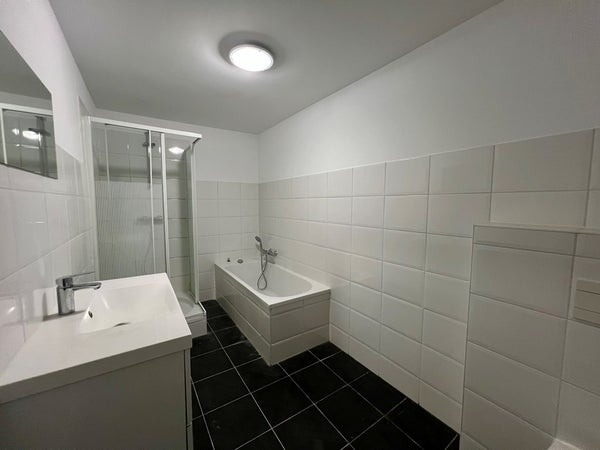 La salle de bain est équipée d'une baignoire, d'une douche, d'un radiateur pour serviettes, d'un lavabo et d'un miroir.
