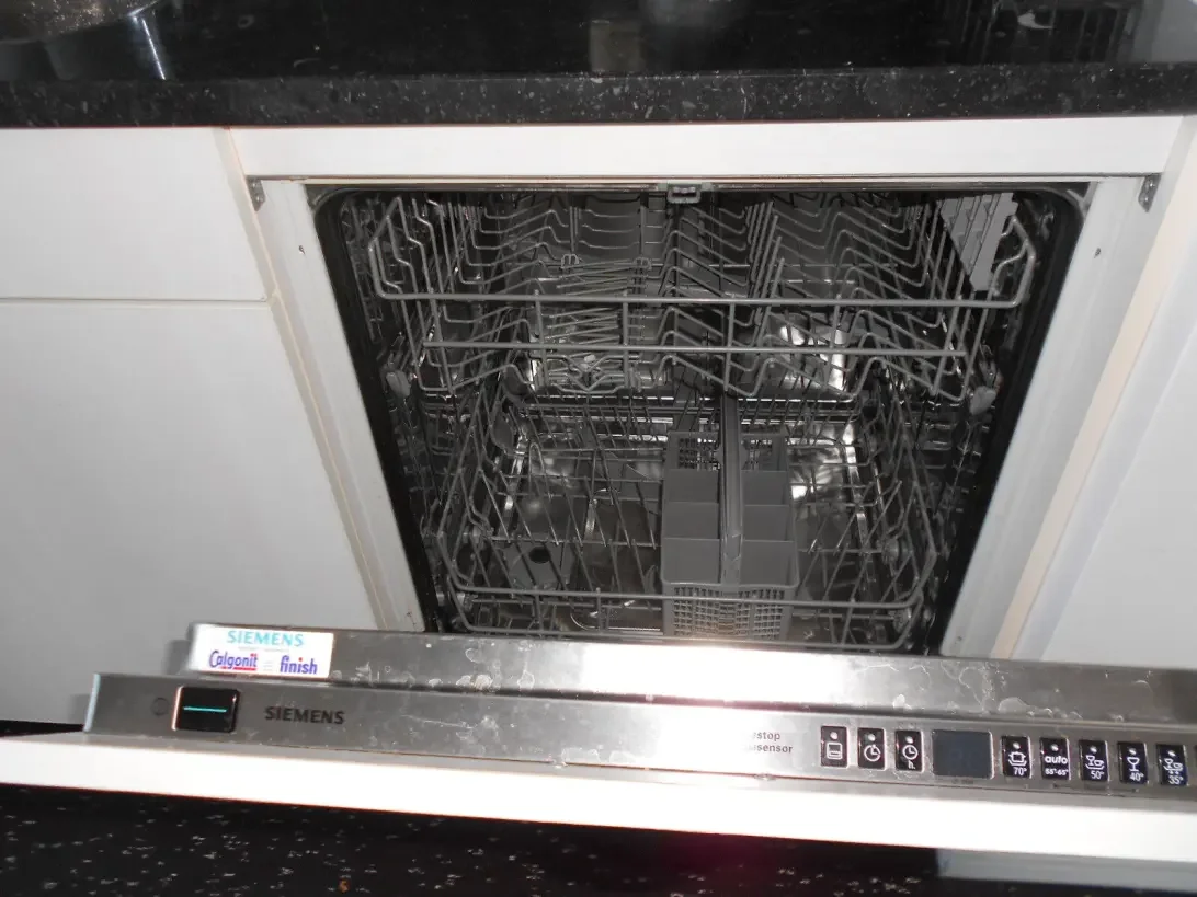 La cuisine moderne ouverte comprend un îlot de cuisson et des appareils encastrés tels qu'une plaque de cuisson à induction, une hotte, un four, un réfrigérateur avec compartiment congélateur et un lave-vaisselle. L'espace repas est situé à côté de la cuisine.