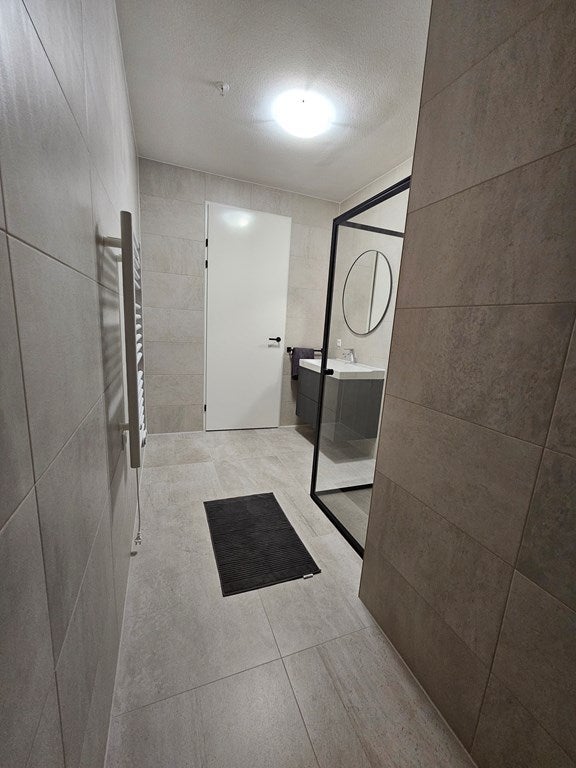 L'appartement dispose d'un hall spacieux qui mène à un toilette séparé et à une salle de bain spacieuse et luxueuse avec douche à l'italienne, un bel lavabo XL avec meuble, et une buanderie équipée d'un lave-linge et d'un sèche-linge.
