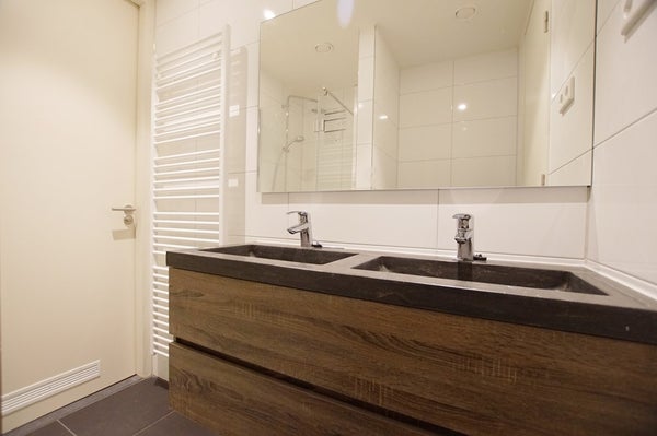 La chambre spacieuse est située au niveau inférieur, offrant intimité et un coin tranquille pour se détendre. La salle de bains moderne est équipée d'une cabine de douche, d'un lavabo avec rangement et d'un radiateur à serviettes. Il y a aussi un WC séparé pour plus de confort. De plus, l'appartement dispose d'un espace de rangement intérieur avec des raccordements pour un lave-linge et un sèche-linge.