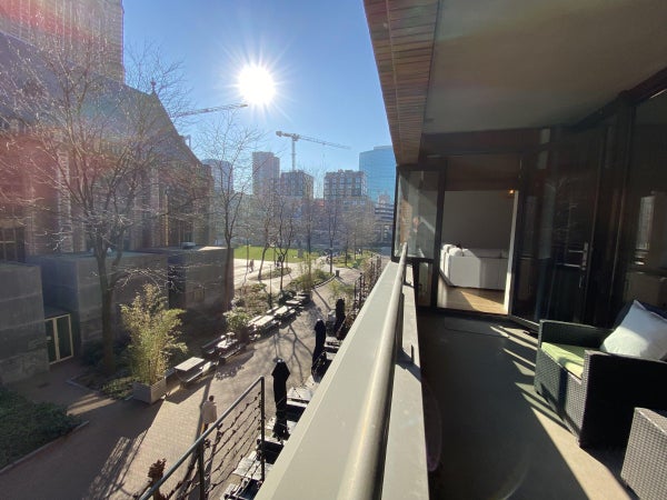 L'espace extérieur couvert fait environ 10 m2. Vous pourrez y profiter tranquillement du soleil et de la vue sur le convivial Grotekerkplein. Le balcon intérieur offre également un agréable endroit où profiter le soir et par temps de pluie.