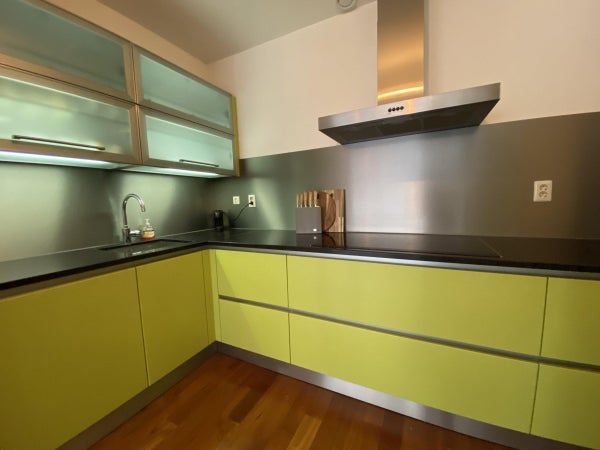 De retour dans le salon, vous trouverez une cuisine ouverte bien agencée en angle. La cuisine dispose d'un espace de rangement suffisant et inclut un lave-vaisselle intégré, une plaque de cuisson à induction et une combinaison réfrigérateur-congélateur.