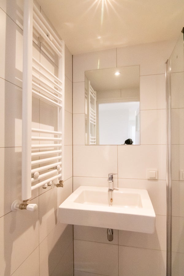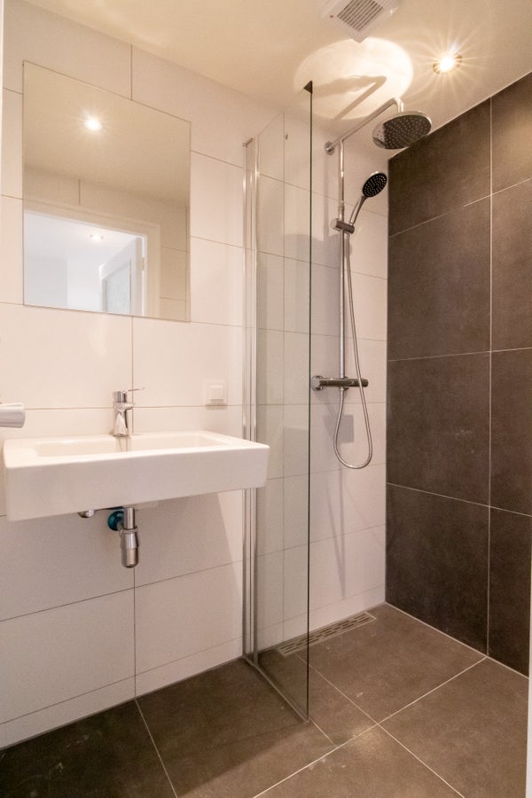 La salle de bain est équipée d'une douche et d'un lavabo avec miroir.