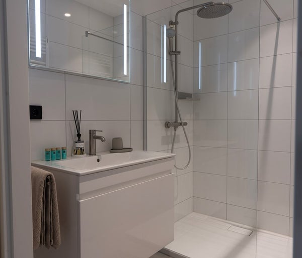 La salle de bains est finie à un niveau élevé et a une allure luxueuse, équipée d'une spacieuse douche à l'italienne et d'appareils sanitaires modernes. De plus, il y a des toilettes séparées, offrant plus de confort et de vie privée.