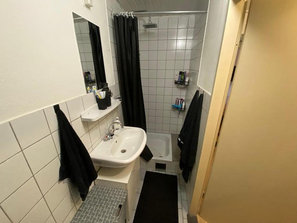 Salle de bain avec douche, toilettes et lavabo. Le raccordement pour la machine à laver se trouve dans une pièce séparée dans le couloir. La chambre se trouve au bout du couloir.