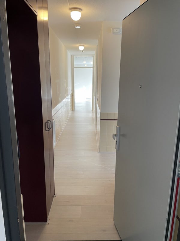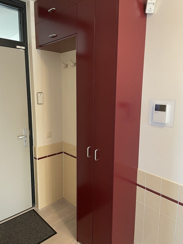 Le porche donne accès à trois appartements. Le logement dispose d'un hall spacieux avec revêtement en carreaux et installation vidéo, un toilet et une salle de bain avec douche, baignoire et lavabo. De plus, l'appartement dispose de 2 chambres spacieuses.