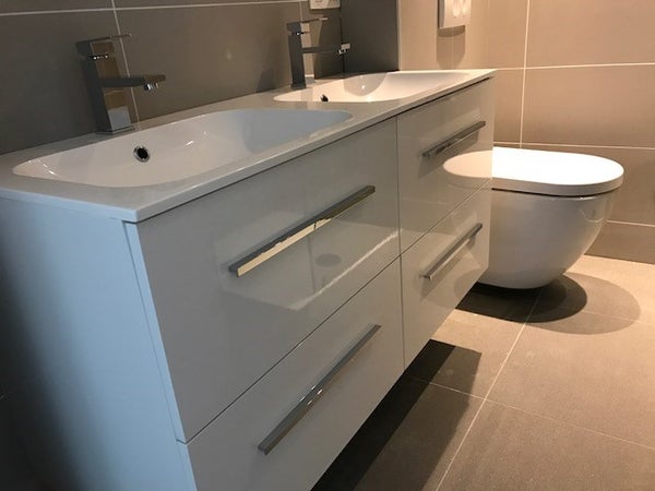 Salle de bain luxueusement finie, équipée d'un deuxième toilette, d'une douche à l'italienne, d'un lavabo, d'une ventilation mécanique et de nouveaux carreaux.
