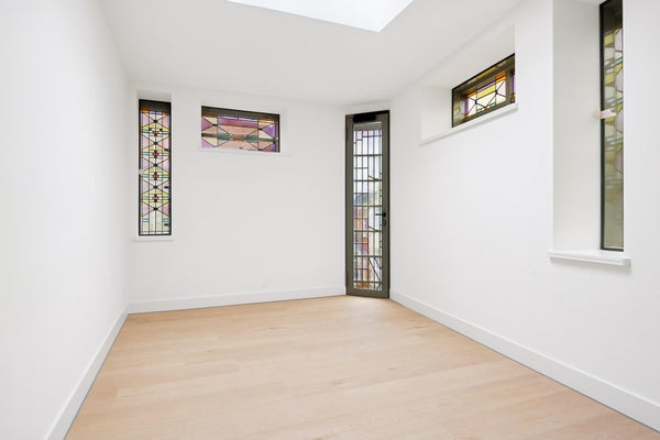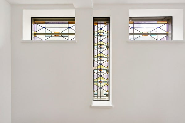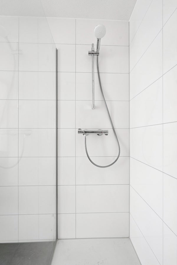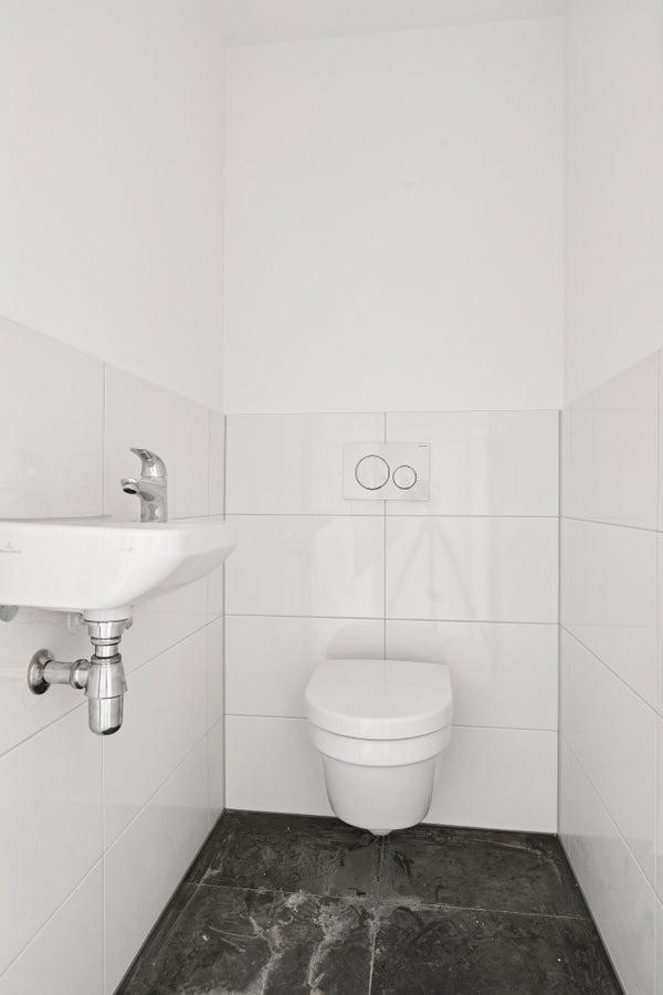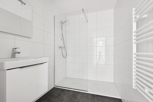 Adjacent au salon se trouve un hall surélevé donnant accès aux deux chambres (environ 17,1 et 13,8 m²) et à la salle de bain moderne et complète. Les deux chambres sont équipées de fenêtres en vitrail avec double vitrage. La chambre plus petite dispose également d'un puits de lumière. La salle de bain est dotée d'un lavabo avec meuble, d'une douche, d'un WC suspendu, d'un radiateur à serviettes et des raccordements pour votre machine à laver et votre sèche-linge. Depuis la chambre plus grande, vous pouvez accéder à un espace buanderie avec les raccordements pour la machine à laver et le sèche-linge.