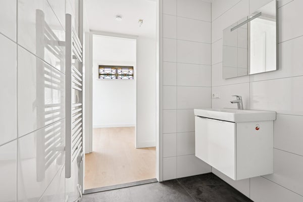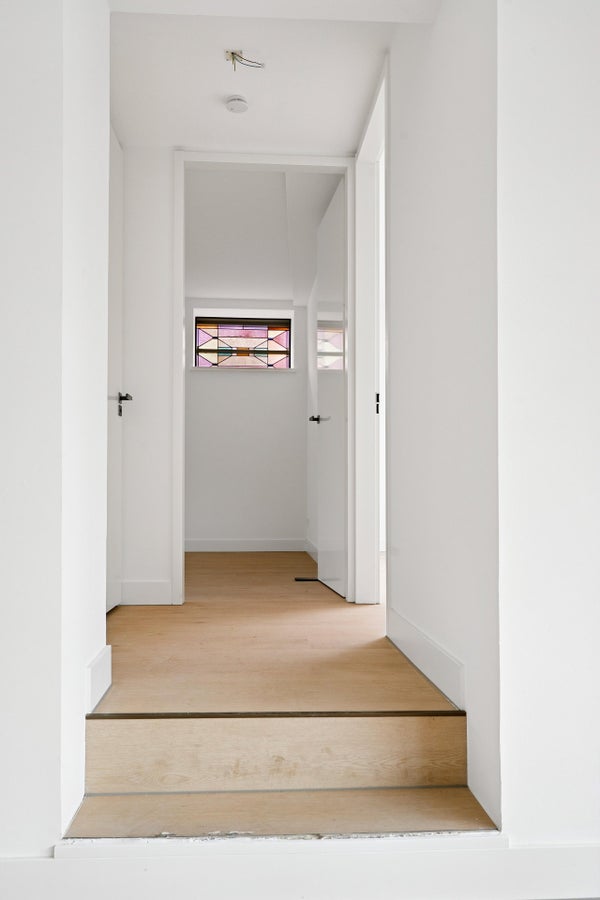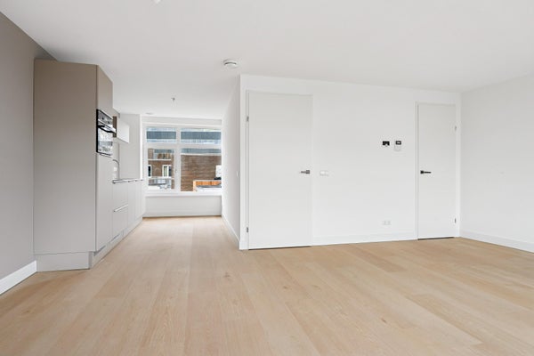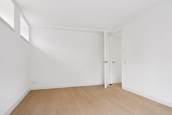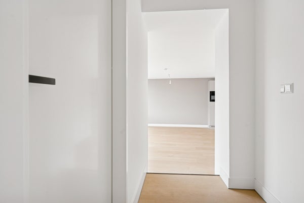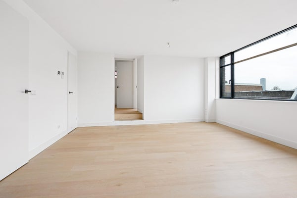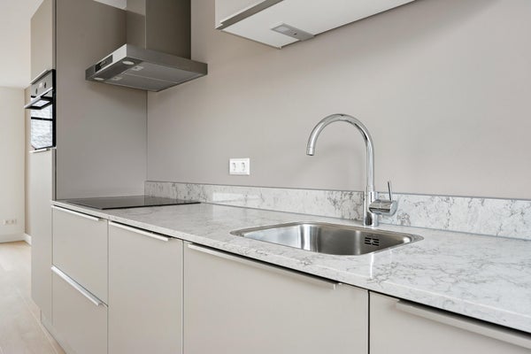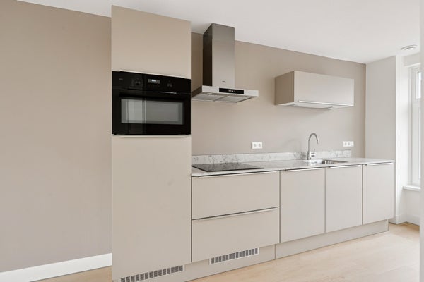 Vous entrez dans le hall qui donne accès au salon et à un toilette avec lavabo. Ensuite, vous pénétrez dans le salon spacieux d'environ 34,4 m² avec un plafond haut et une cuisine ouverte moderne. La cuisine est entièrement équipée avec, entre autres, un réfrigérateur avec congélateur, un lave-vaisselle, une table de cuisson par induction avec hotte et un four combiné.