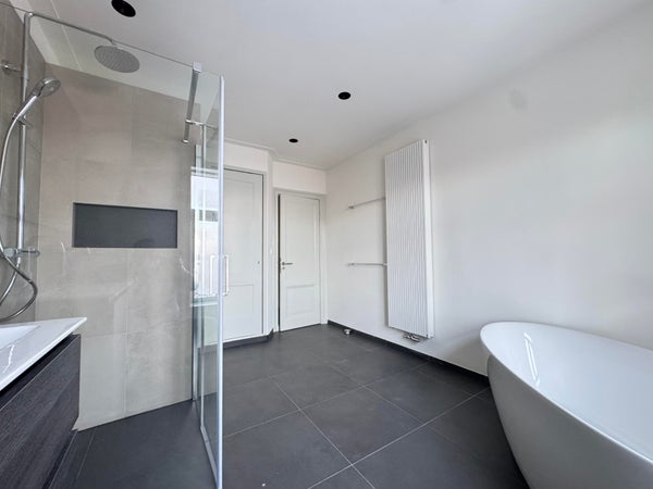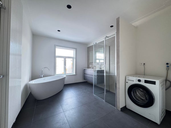 2ème étage; 2 chambres spacieuses avec un parquet en bois. Cuisine moderne avec plan de travail en pierre, plaque de cuisson à induction, lave-vaisselle et four combiné spacieux. Réfrigérateur avec compartiment congélateur. Toilettes séparées. Salle de bain moderne spacieuse avec double vasque, douche à l'italienne et baignoire autoportante. Connexion pour machine à laver avec machine à laver.