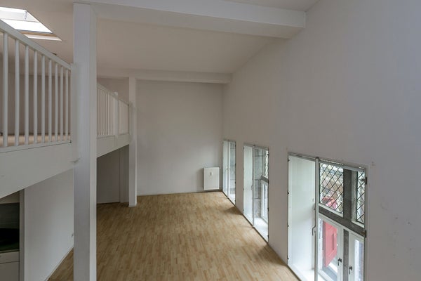 Les grandes fenêtres originales assurent que le salon et la mezzanine profitent de beaucoup de lumière naturelle et donnent une impression d'espace. L'appartement dispose d'un joli sol en stratifié dans le salon et la mezzanine. La cuisine ouverte moderne est équipée d'un bloc cuisine et d'une hotte. Une cuisinière avec four et un lave-vaisselle sont disponibles à la reprise. La salle de bain comprend une douche, un lavabo, des toilettes et un branchement pour machine à laver. La chambre avec velux est très spacieuse et offre une vue ludique sur l'appartement depuis la mezzanine. Il y a suffisamment d'espace pour un bureau à l'étage.