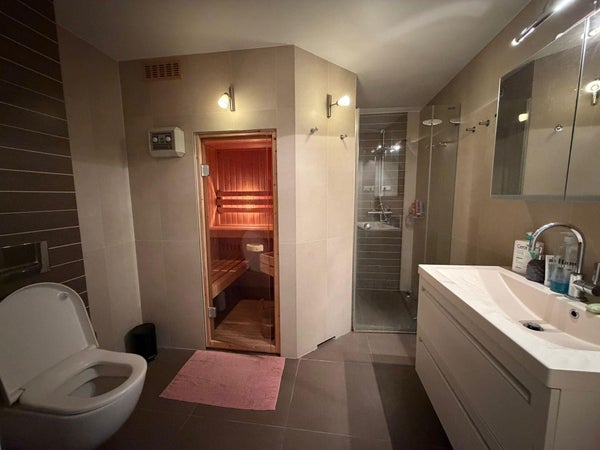 Vous sortez de l'ascenseur et entrez dans le hall avec accès au balcon et à la porte d'entrée de l'appartement. Un long hall qui donne accès à toutes les pièces. L'appartement fait environ 140 m2 et est très spacieux. Toilette séparée avec lavabo, grand espace de rangement intérieur avec machine à laver et zone de stockage. Le grand salon donne accès à la terrasse intérieure d'environ 12 m2. La cuisine est en connexion ouverte avec le hall et le salon et est équipée de toutes les commodités luxueuses telles qu'une plaque de cuisson à induction, une hotte, un réfrigérateur avec congélateur, un four, un micro-ondes et un lave-vaisselle. De plus, il y a plus qu'assez d'espace de rangement et vous profitez d'une vue dégagée pendant la cuisine. L'appartement dispose de 3 grandes chambres. La chambre principale est équipée d'un placard. La salle de bains très luxueuse est équipée d'un lavabo avec meuble, d'une douche, d'un deuxième toilettes et d'un sauna !