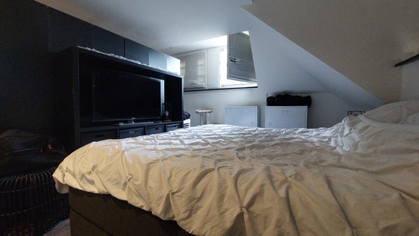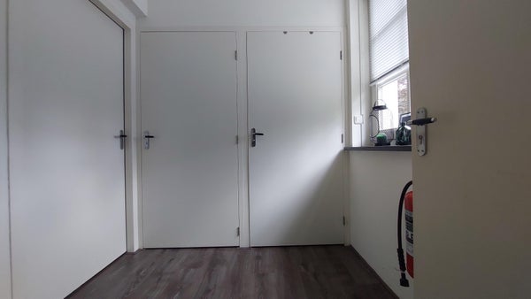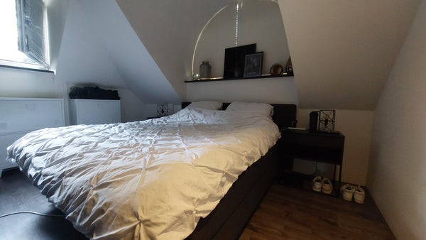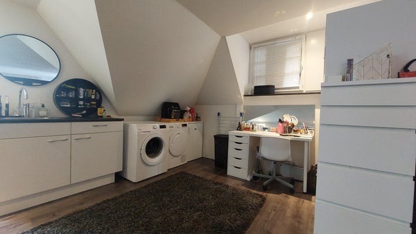 Par le hall mentionné précédemment, vous accédez également à la chambre, qui est actuellement divisée par des armoires en un espace de sommeil avec un beau lit double et un espace bureau où un lave-linge peut également être trouvé.