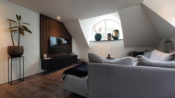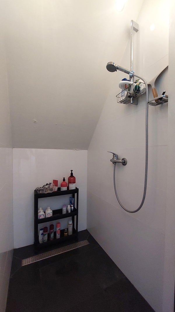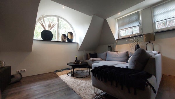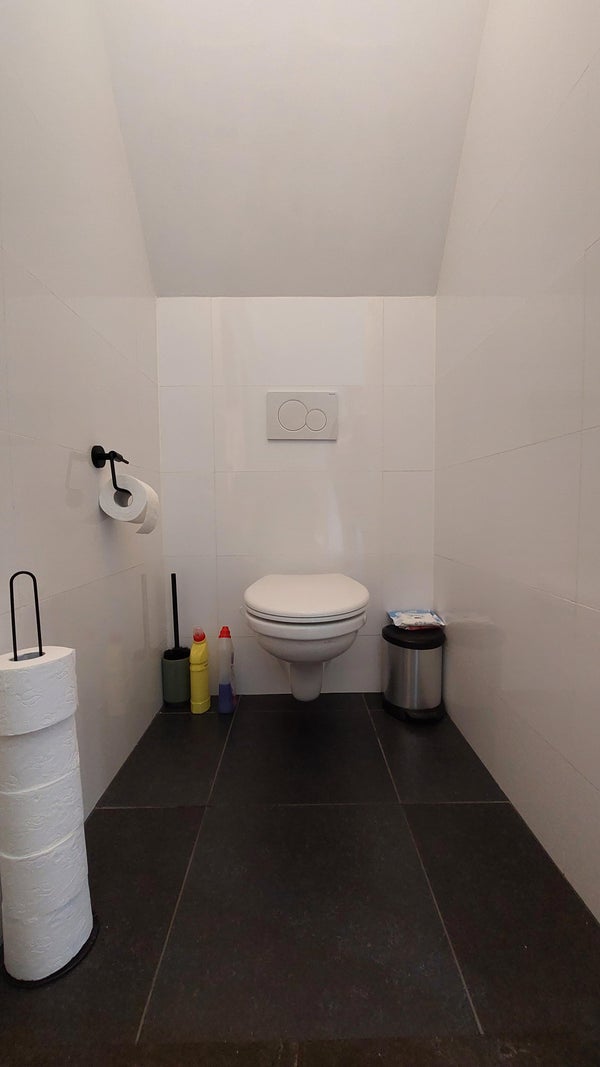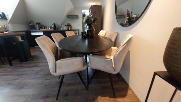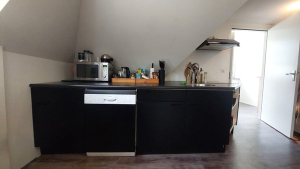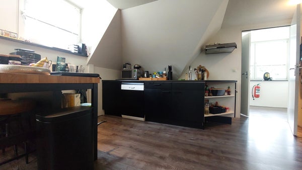 Vous accédez au deuxième étage par les escaliers, et dans le hall, il y a un accès à un toilette séparé et à une douche. Par la porte, vous entrez dans une cuisine très soignée, équipée de tous les appareils tels qu'une plaque de cuisson à induction, un réfrigérateur, un micro-ondes, une hotte aspirante et un lave-vaisselle. La cuisine ouverte offre une vue spacieuse sur le salon avec un bel espace à manger.