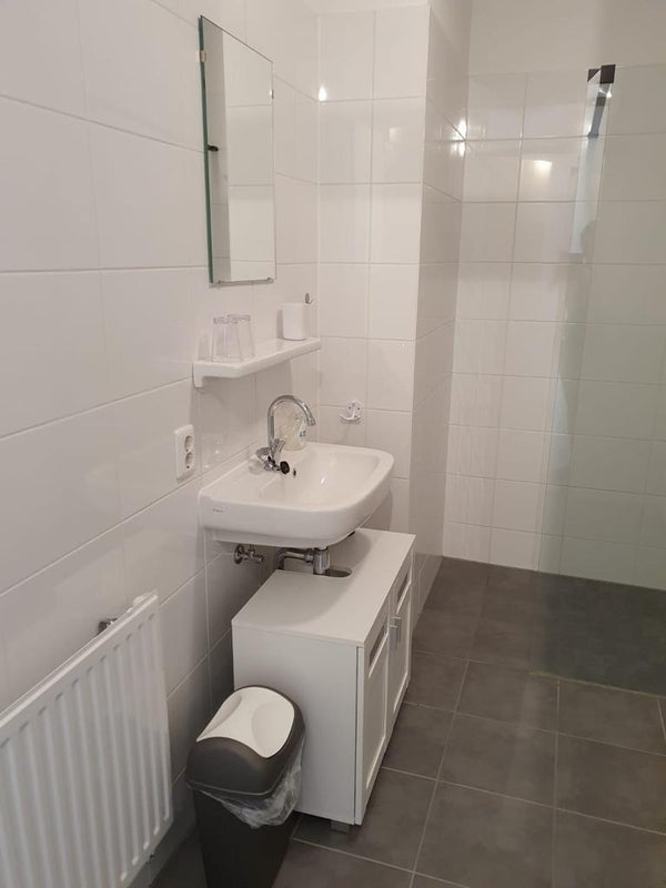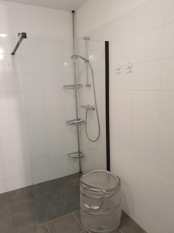 La salle de bain est bien entretenue et équipée d'une douche à l'italienne et d'un meuble lavabo. Les toilettes sont séparées. De plus, il y a une salle de stockage séparée avec de la place pour le lave-linge.