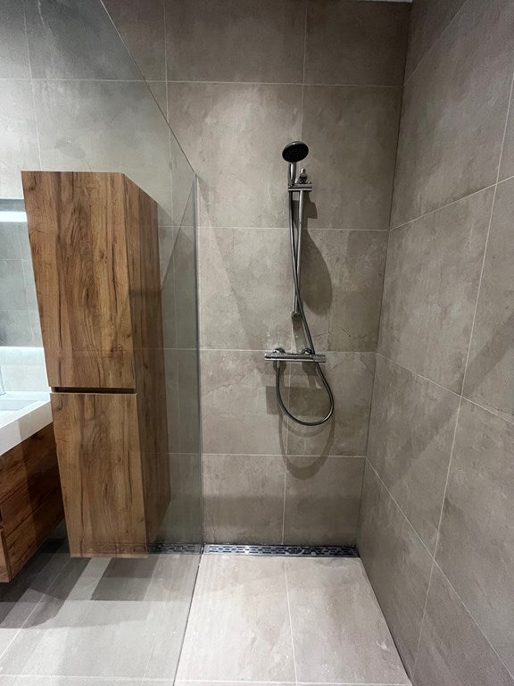 La salle de bain est un véritable point focal, aménagée de manière luxueuse avec une baignoire autoportante, une douche à l'italienne spacieuse, un meuble lavabo double et un radiateur design élégant.