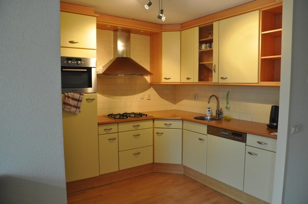 Cocina en forma de L con cocina de gas, campana extractora, lavavajillas, refrigerador y horno.