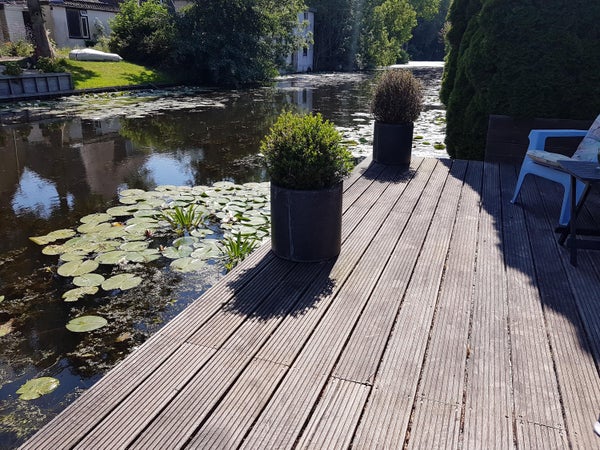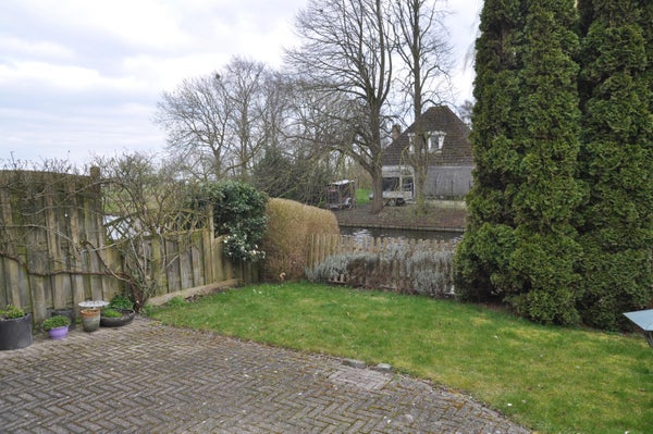 La casa adosada ampliada con garaje está situada junto al agua y tiene un jardín orientado al sur. Y un muelle junto al agua.