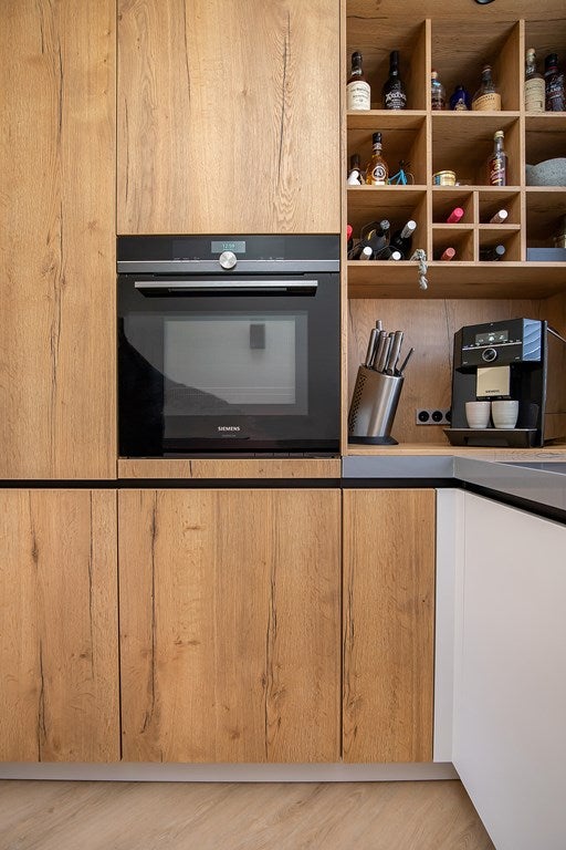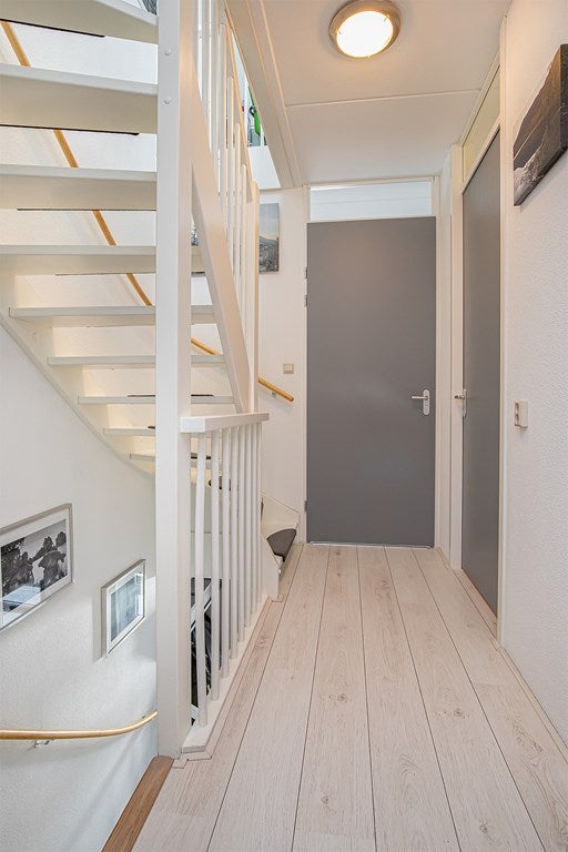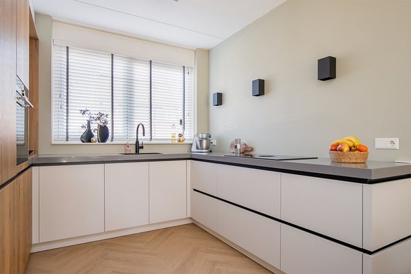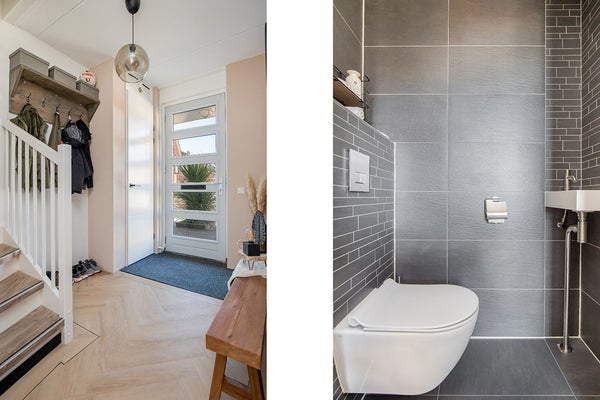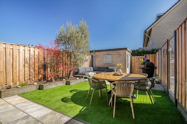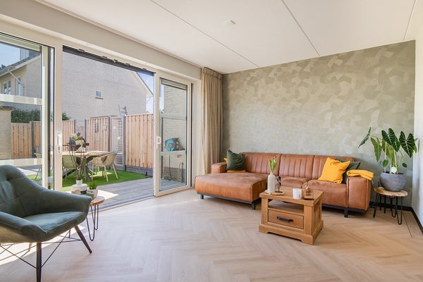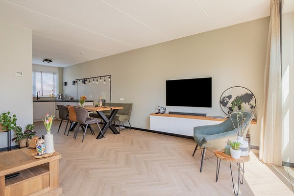 Vestíbulo de entrada con armario de contadores y un inodoro con lavabo. Desde el vestíbulo, se entra en la espaciosa sala de estar, el comedor y la cocina. La cocina está completamente equipada con un frigorífico, congelador, placa de inducción con extractor incorporado, horno, Quooker, microondas, fregadero y lavavajillas. Mientras que las áreas de estar y comedor están sin amueblar, hay mucho espacio para una gran mesa de comedor para seis y un amplio sofá rinconero con mesa de café. El mueble de TV permanecerá en la propiedad. Las puertas correderas del salón llevan al jardín de bajo mantenimiento, que cuenta con pavimento y césped artificial, perfecto para barbacoas de verano con amigos.