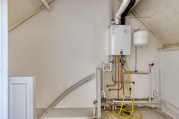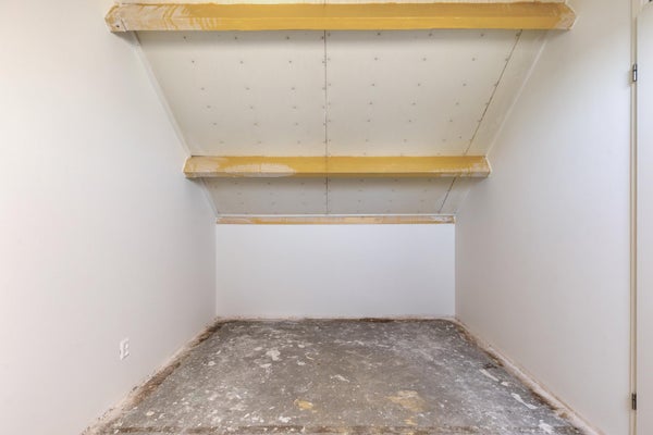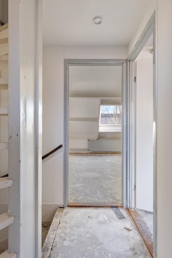 Una escalera fija conduce al segundo piso. En el distribuidor del segundo piso encontrará el espacio para la lavadora y secadora. Además, encontrará en el distribuidor el espacio para la instalación de calefacción, un armario de almacenaje y el acceso al tercer dormitorio (habitación de ático).