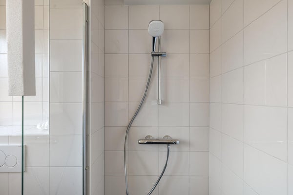 El baño, al igual que el aseo, está cuidadosamente terminado. Incluye ducha, 2.º aseo, radiador para toallas y lavabo con espejo sobre él. El baño está casi completamente alicatado.