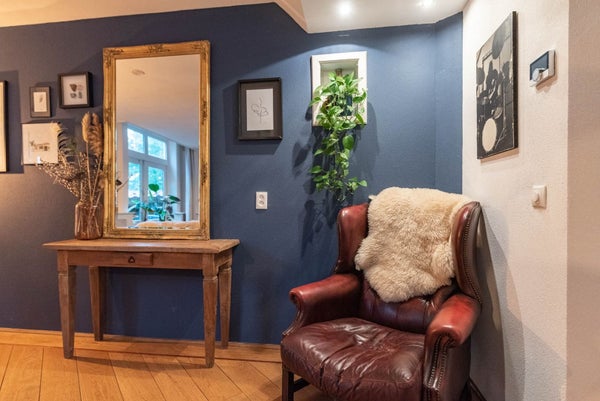 La casa cuenta con una amplia sala de estar con mucha luz natural gracias a las grandes ventanas. La encantadora estufa de leña da a la sala de estar un ambiente cálido y acogedor. La cocina separada está equipada con electrodomésticos modernos y ofrece suficiente espacio para preparar comidas y disfrutar del tiempo juntos. La terraza cubierta es accesible a través de las puertas francesas. En el primer piso hay cuatro dormitorios y un baño de lujo con bañera, ducha, lavabo y inodoro.