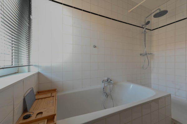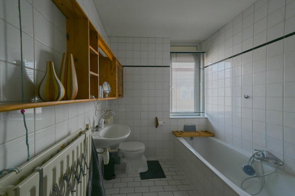 El baño está completamente equipado con bañera, ducha a ras de suelo, inodoro, radiador y lavabo.