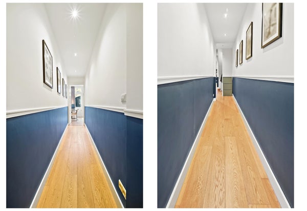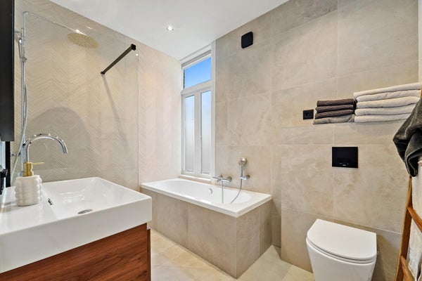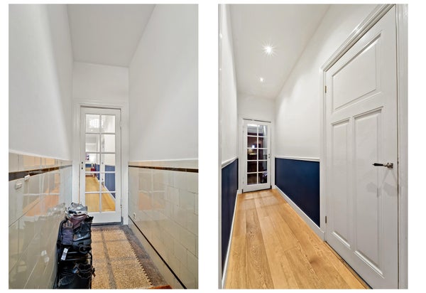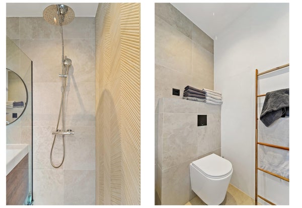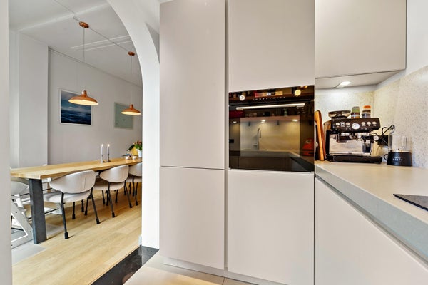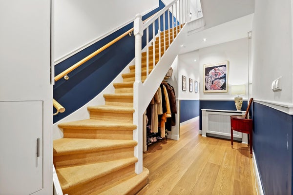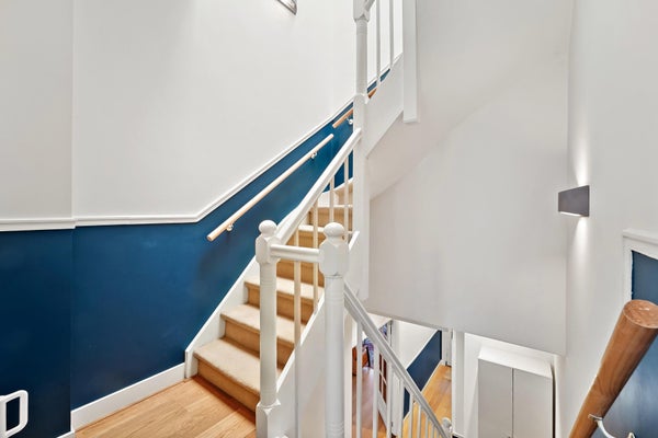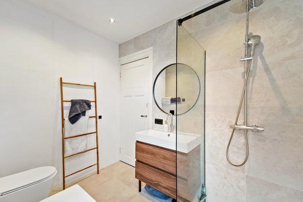 Pasillo que conduce a la espaciosa sala de estar/comedor con jardín soleado adyacente y una cocina muy completa con todos los electrodomésticos. Aseo de invitados y habitación ubicada en el lado del jardín. En el primer piso hay una habitación y un baño con bañera, ducha y lavabo, incluido calefacción por suelo radiante. En el segundo piso hay otras 2 habitaciones.