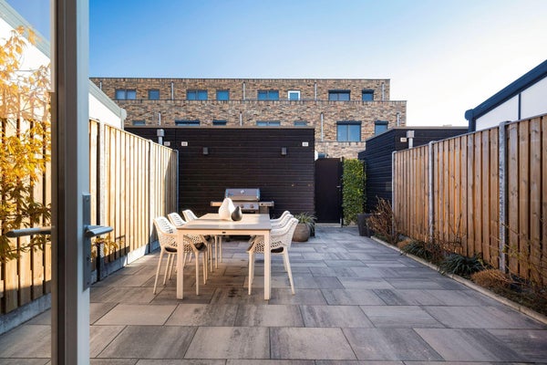• Jardín: diseño de bajo mantenimiento con terraza, acceso trasero y práctico trastero