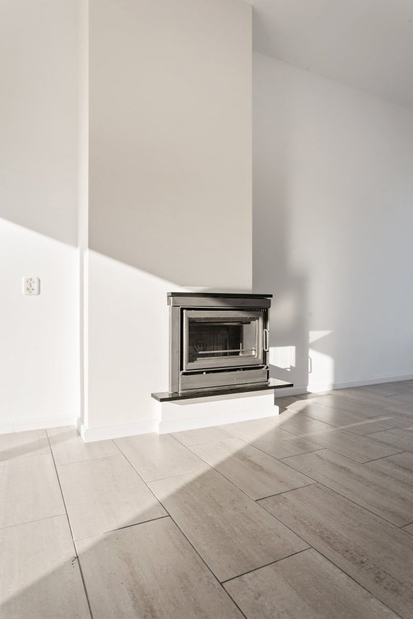 Sala de estar: Amplia sala de estar con vistas despejadas, suelo de azulejos moderno con calefacción por suelo radiante y hermosa chimenea. Acabados de paredes y techos con estuco fino. Luz solar agradable a través de las grandes ventanas y puertas correderas al jardín.