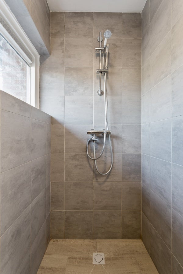 Baño: Baño moderno de azulejos, ubicado en la parte delantera, con ducha a ras de suelo y grifo de termostato. Unidad de tocador práctica con lavabo de diseñador.
