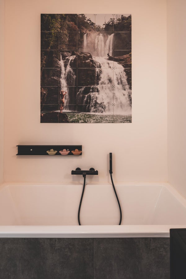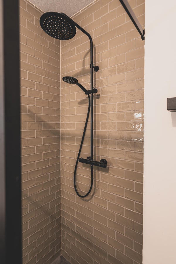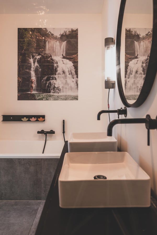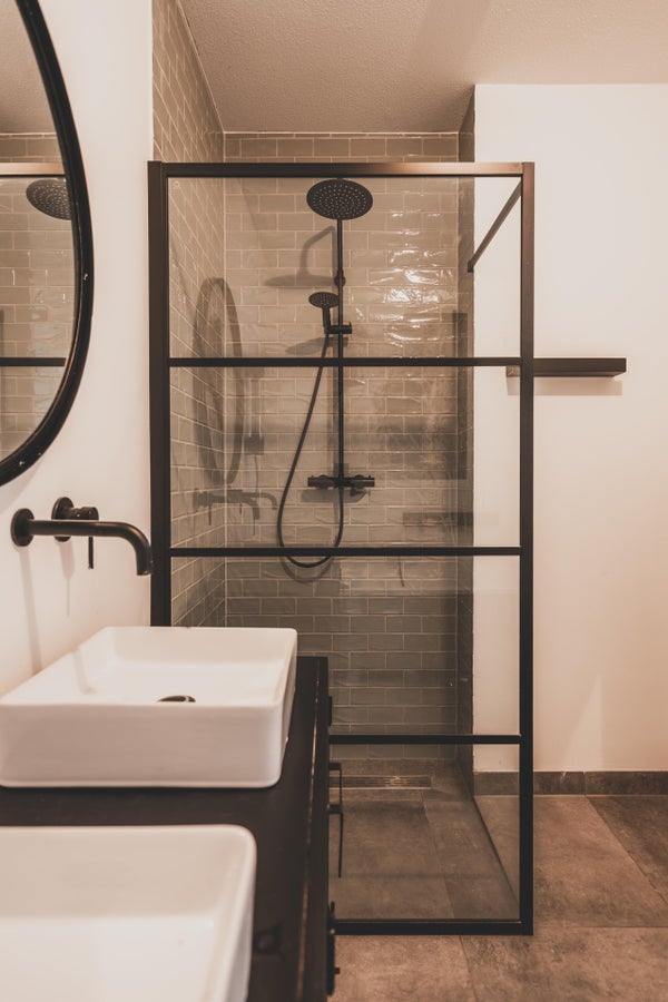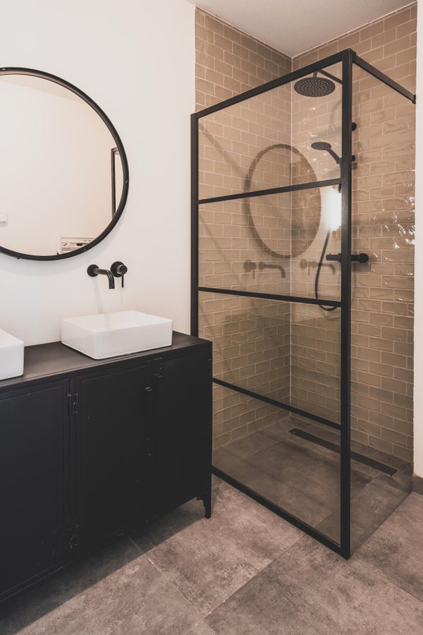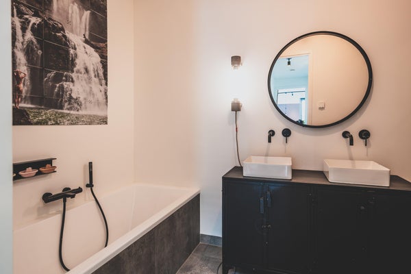 El baño está ricamente equipado con una combinación de colores blancos con tonos negros/grises y un acabado beige. Este baño consta de una bañera, una amplia ducha a ras de suelo y un lavabo doble con revestimiento.