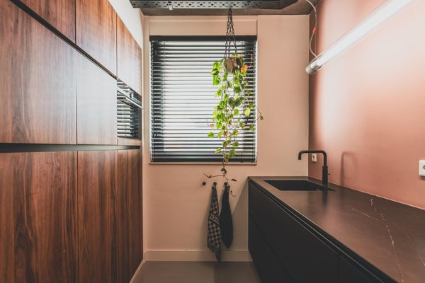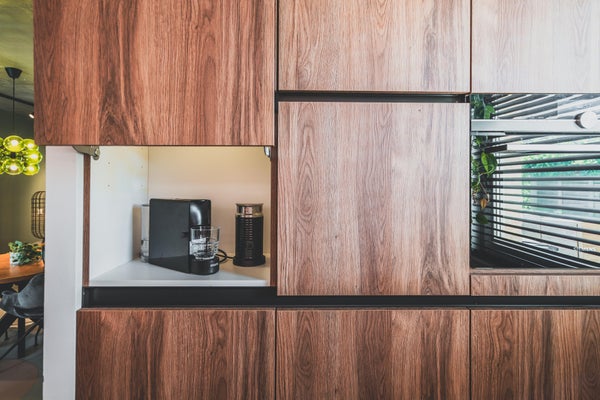 Desde la sala de estar, puede acceder a la cocina semiabierta en la parte delantera de la casa, que complementa magníficamente el estilo de la sala de estar. La cocina está equipada con, entre otras cosas, un horno de vapor combinado, una combinación de frigorífico-congelador, lavavajillas, placa de inducción de 4 fuegos y grifo Quooker.