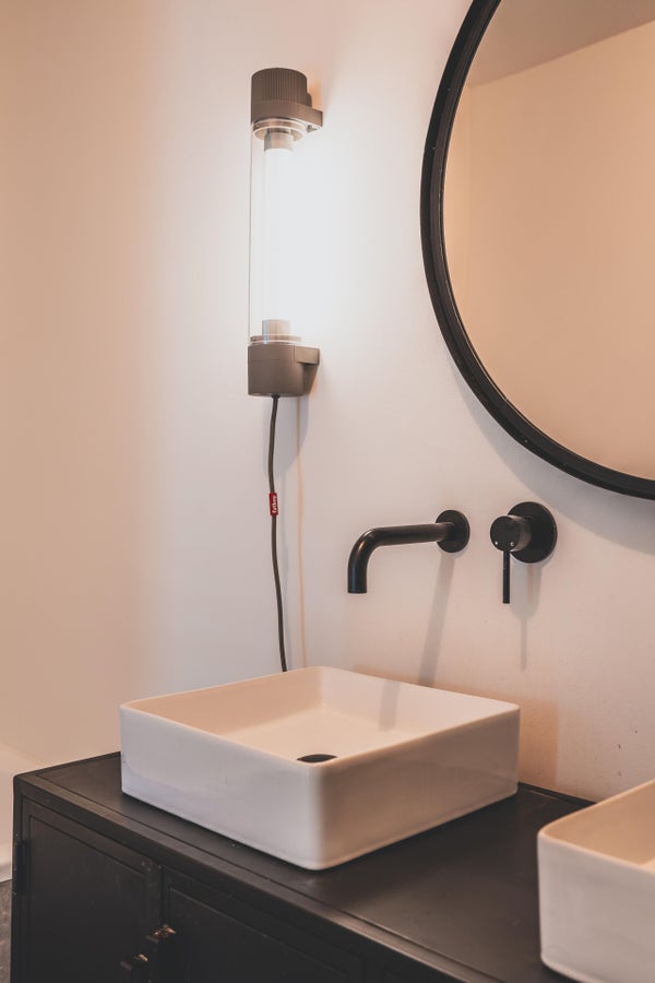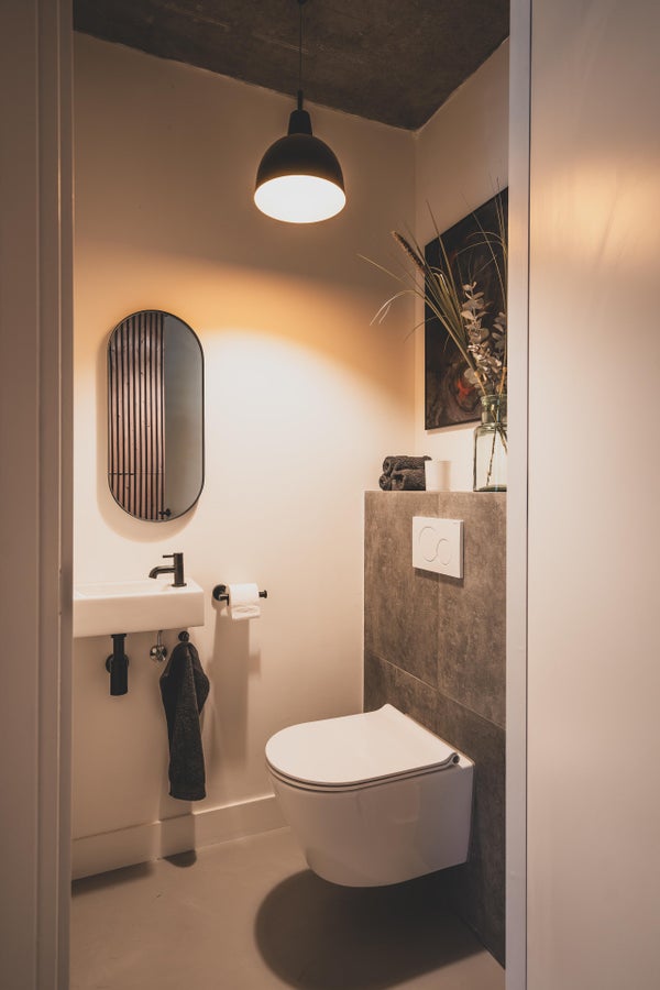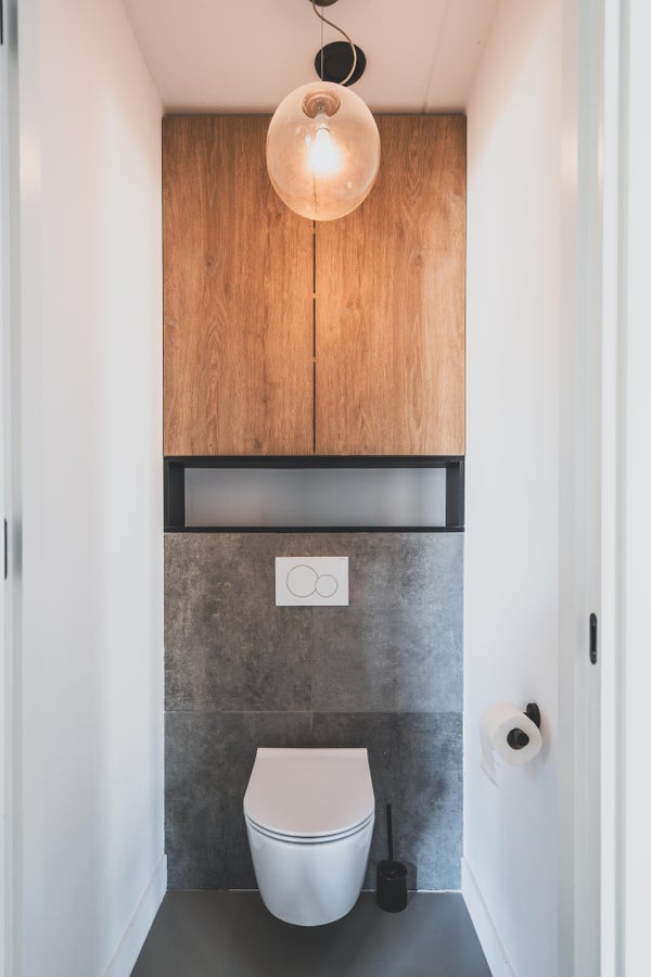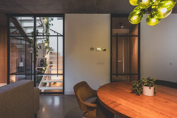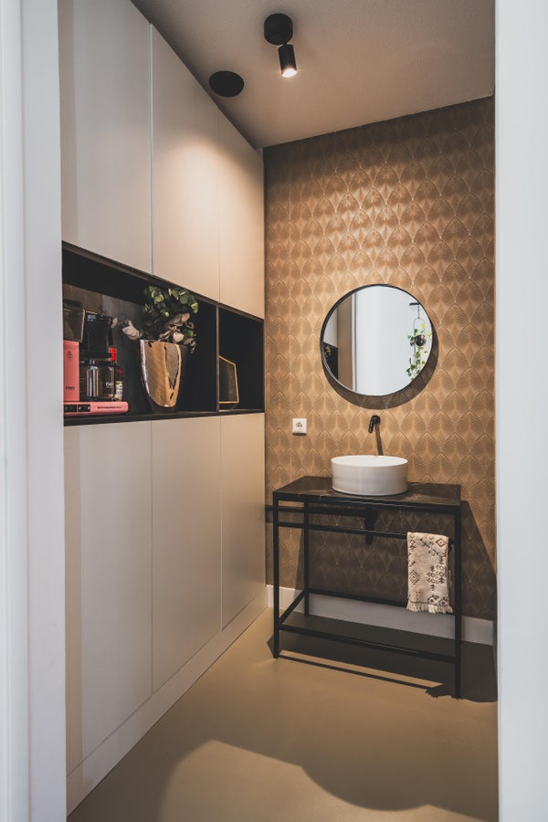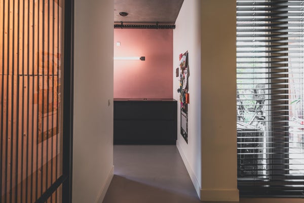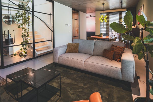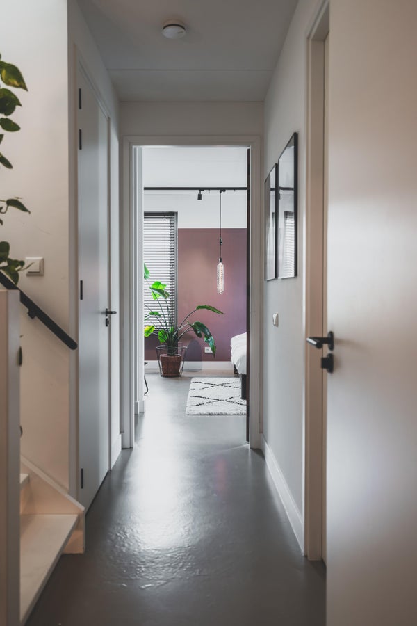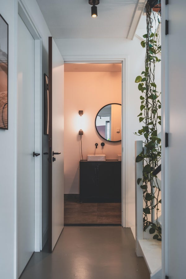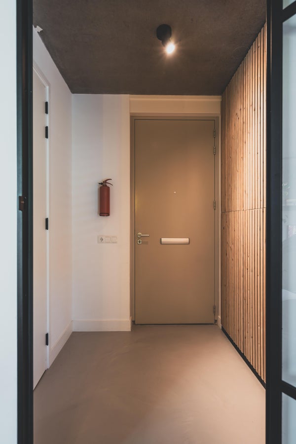 Usted ingresa a la casa a través del pasillo, que tiene un armario moderno camuflado y acceso al baño. A través de la impresionante puerta pivotante negra, llega a la sala de estar.