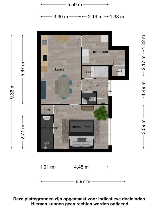 Desde la calle, la entrada cubierta es accesible a través de una pequeña escalera. El vestíbulo/entrada cuenta con un suelo de azulejos claro y proporciona acceso al inodoro, al armario de contadores y a la cocina. En la espaciosa cocina-comedor de 19 m2, te atrapará de inmediato el espacio y la luz. Hay contacto directo con la sala de estar a través de la entreplanta. La cocina está equipada con un diseño en forma de L con mucho espacio de trabajo y almacenamiento. La cómoda cocina está equipada con todos los electrodomésticos, incluyendo lavavajillas, nevera, congelador?, placa de cocción, horno combinado, microondas y extractor. Desde la cocina se accede al dormitorio en la planta baja. Este amplio dormitorio tiene buenas dimensiones y está equipado con un suelo laminado. Adyacente se encuentra el baño con ducha a ras de suelo y lavamanos. También desde la cocina, se accede al trastero. Este espacioso trastero está integrado, equipado con electricidad y tiene también acceso directo al exterior.