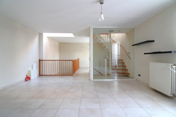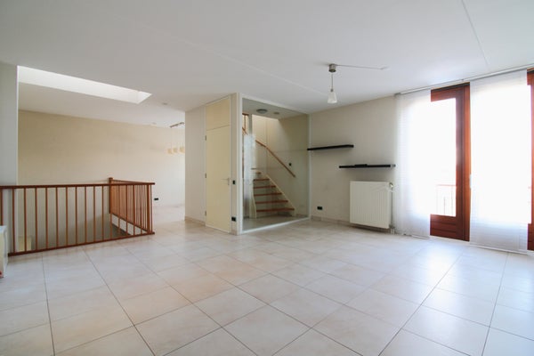 En el primer piso se encuentra la sala de estar muy espaciosa. Este espacio está equipado con un suelo de azulejos claro y tiene una gran cantidad de luz natural debido a las grandes ventanas. También hay un bonito contacto con la cocina en la planta baja gracias a la entreplanta. Junto a la sala de estar, hay un encantador rinconcito para un estudio o una zona de juegos. Ideal para trabajar desde casa en estos tiempos.