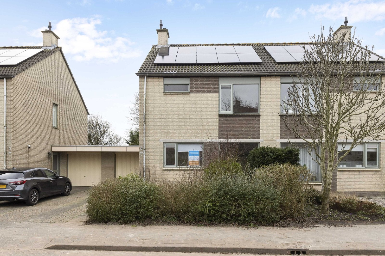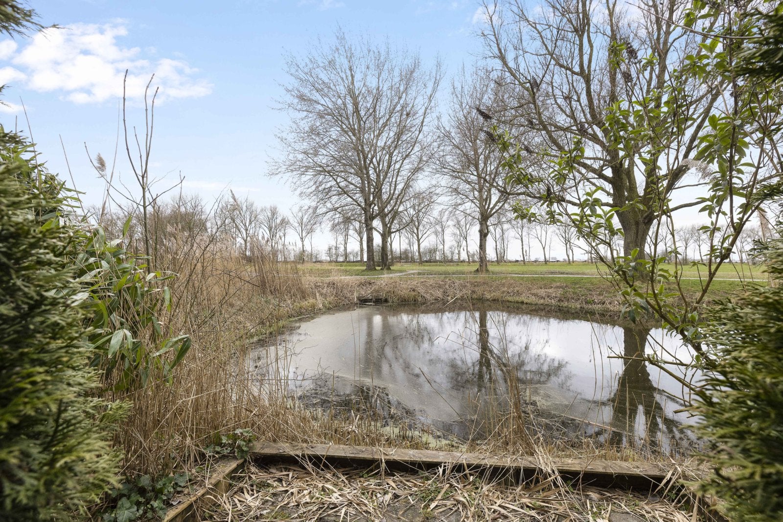 La casa adosada tiene jardines que dan a un estanque, ofreciendo una vista despejada de los campos desde la sala de estar y el jardín. La distribución incluye una sala de estar en forma de Z orientada al jardín, una cocina semi-abierta y un garaje. En el primer piso hay 3 dormitorios y un baño con bañera, ducha y un segundo inodoro. El segundo piso cuenta con un gran ático.
