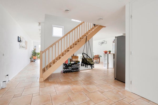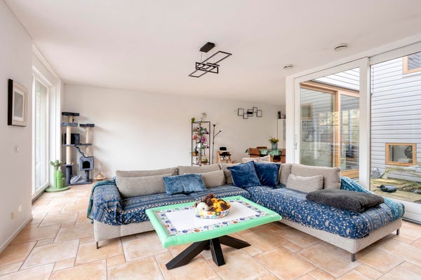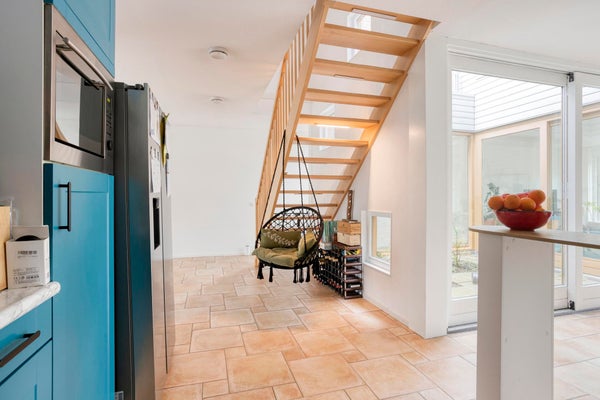 Entrada con pasillo y acceso a los aseos modernos y al trastero. La luminosa y acogedora sala de estar está rodeada de un jardín interior (el patio), lo que permite mucha luz natural. Cocina abierta moderna, equipada con varios electrodomésticos integrados como lavavajillas, placa de inducción, campana extractora, horno y microondas. También hay un frigorífico separado con congelador. Desde la sala de estar hay acceso a la terraza bien mantenida junto al agua.