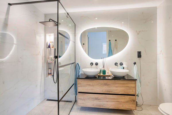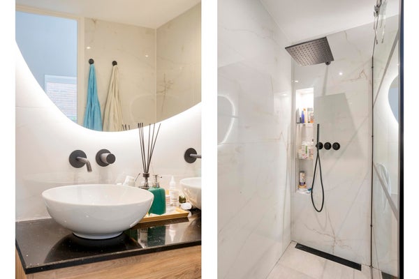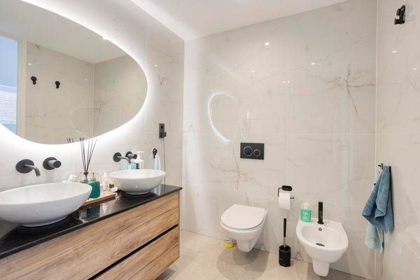 Tres dormitorios, entre los cuales un dormitorio principal. Una de las habitaciones se utiliza actualmente como espacio de trabajo y da acceso a la terraza en la azotea. El moderno baño está equipado con ducha a ras de suelo, lavabo doble, bidet y aseo.