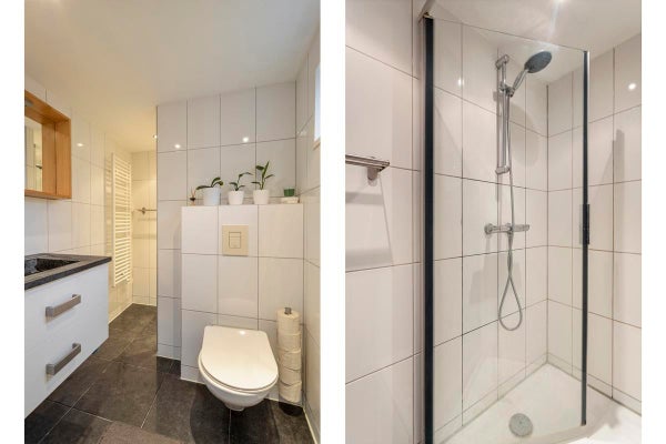 Adyacente se encuentra un trastero con conexión para la lavadora. Desde la cocina también se puede acceder al moderno cuarto de baño, que está equipado con ducha, inodoro, radiador de diseño y mueble de lavabo.