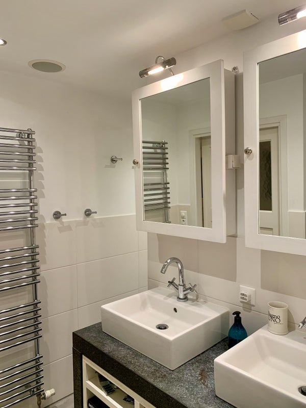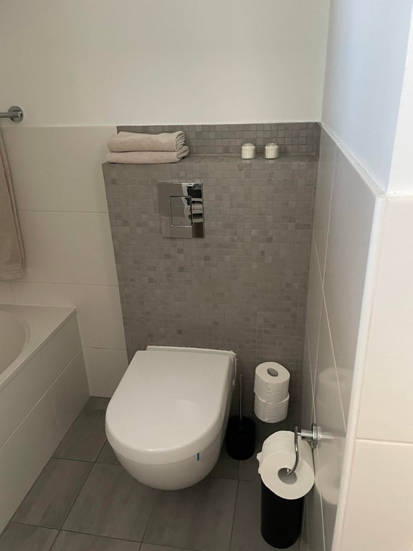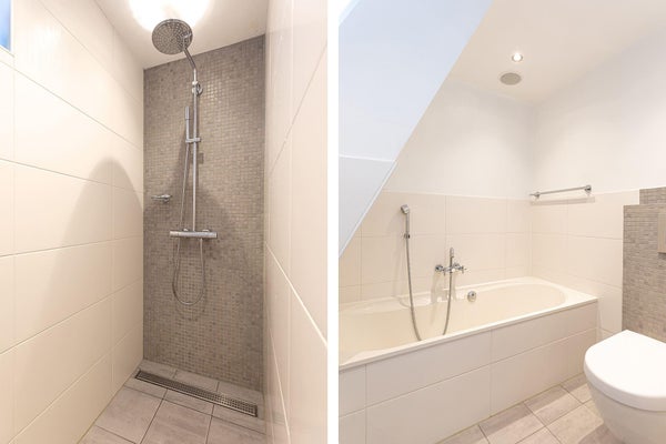 Primer piso: dormitorio principal con vista al jardín, dos habitaciones adicionales: actualmente decoradas como oficina con balcón y un vestidor. La oficina se puede convertir fácilmente en un dormitorio. Baño de lujo con bañera, ducha a ras de suelo, lavabo doble, inodoro suspendido y radiador para toallas.