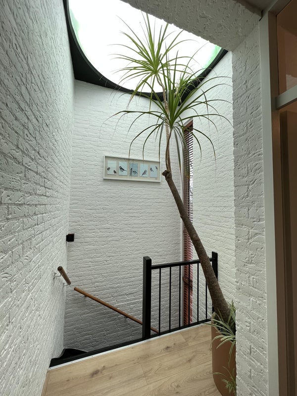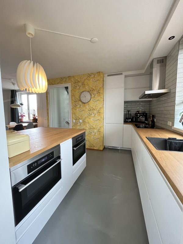 Escalera alta con una claraboya en la parte superior. En el primer piso se encuentra la puerta a la sala de estar. Esta tiene ventanas por todos lados, permitiendo que entre mucha luz. Amplia y acogedora sala de estar con calefacción por suelo radiante. Cocina moderna con todos los electrodomésticos necesarios.